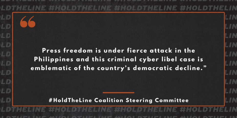 The Hold The Line Coalition condemns the Philippine Court of Appeals decision to uphold the conviction of Nobel Laureate Maria Ressa and former Rappler researcher Rey Santos Jr. on trumped-up charges of cyber libel. Alarmingly, the court’s rejection of their appeal brings Ressa and Santos Jr. a step closer to possible imprisonment.