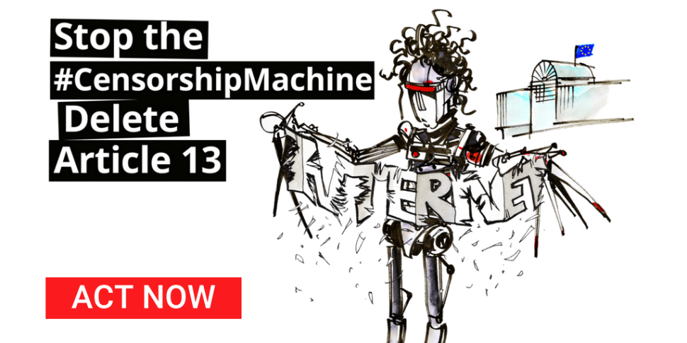 La propuesta de reforma de derechos de autor en la Unión Europea amenaza gravemente la posibilidad de acceder, usar y producir contenidos en internet de manera libre y abierta. De ser aprobado el artículo 13, la disposición de la propuesta de la Directiva sobre derechos de autor, se institucionalizaría la supervisión y eliminación de todo el contenido subido a internet si se detecta una semejanza con contenido protegido por derechos de autor. Las consecuencias de la aprobación de la reforma propuesta incluirían censura generalizada mediante la aplicación de filtros obligatorios e imposición económica al uso de enlaces. El resultado sería una concentración aún mayor del mercado en manos de las grandes industrias y un entorno en línea mucho menos diverso y plural.